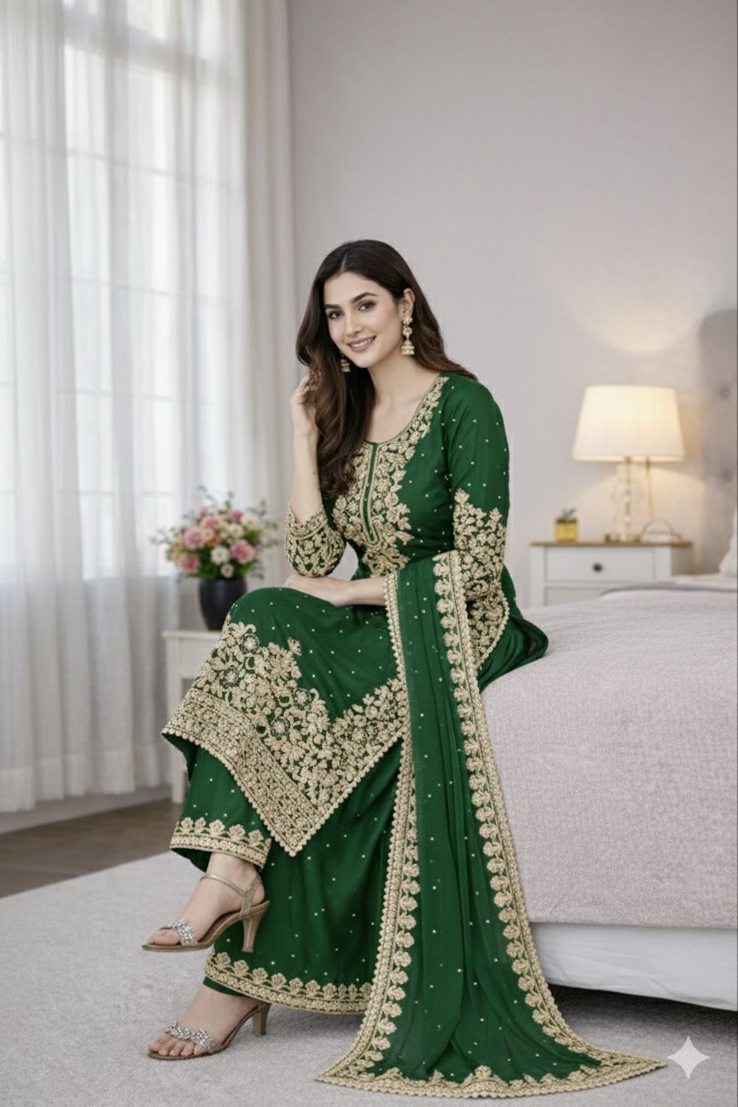 Designer Pure GMY Silk Heavy Embroidered Top Bottom & Dupatta Set - Dark Green / M (38)