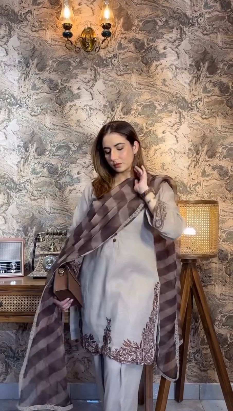Maverick Fusion Fox Georgette Top Bottom Dupatta Set - Greige Gray / M (38)