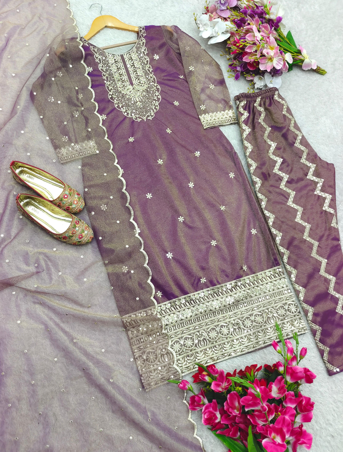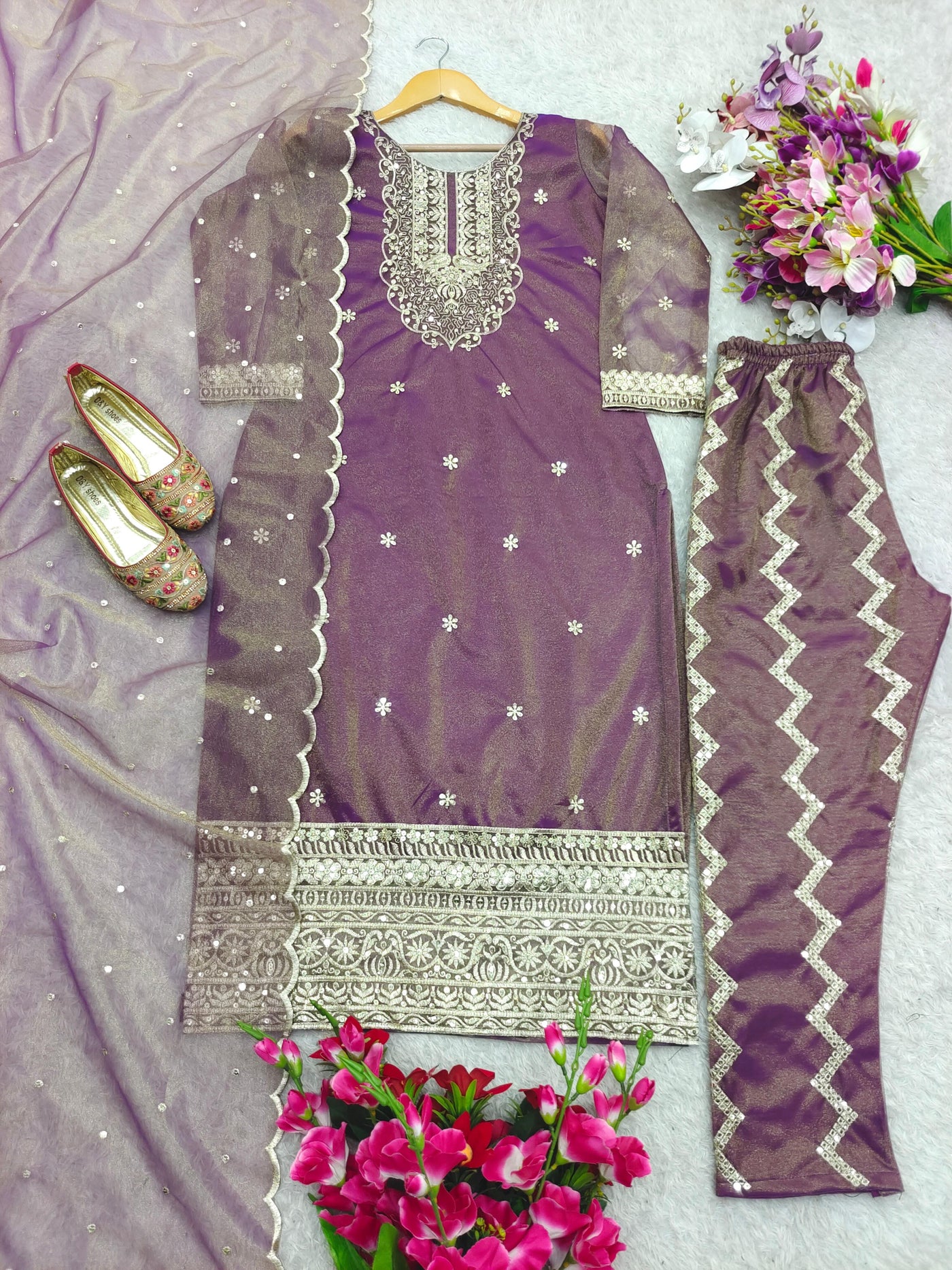 In the charm of timeless elegance and sophisticated artistry, this New Twin-Tisyu Net Top–Pant–Dupatta Set is designed to elevate your festive wardrobe with effortless style.