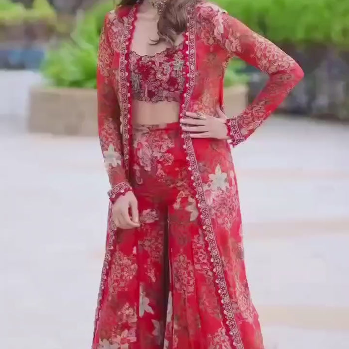 In the charm of contemporary fusion, elevated with artisanal finesse, this Indo Western Koti Plazo Blouse Collection exudes elegance, style, and effortless appeal.