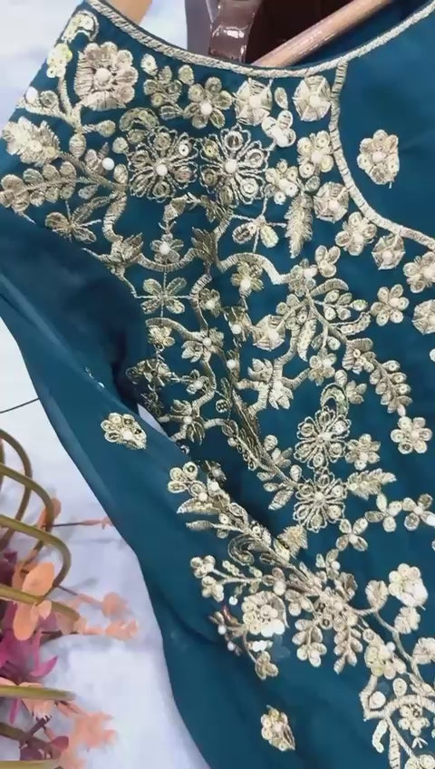 The top, made from premium heavy faux georgette, is adorned with intricate detailing that exudes refined beauty and party-ready charm. Paired with a stylish plazzo, designed for comfort and a flattering silhouette, the ensemble perfectly balances elegance and ease. Completing the look, the matching dupatta adds a graceful touch, enhancing the set’s festive appeal.